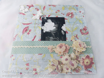 For this page I used the complimenting Wild Asparagus decoupage, some ric rac, prima butterflies and pearl gems representing their flight on the page.