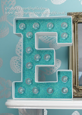 It comes with a letter, LED lights, bulb covers and a template for the letter. This time round I chose an aqua colour glitter paper and cut the outside with scissors and the bulb spaces with a craft knife. You then add the bulb covers through those holes (great because it covers any scruffy attempts to cut for the little bulb holes!) and then you place the LED lights through into the bulb covers. It takes two AAA batteries and the battery box fits neatly into the back of the letter so its easy to hide and to turn off/on.