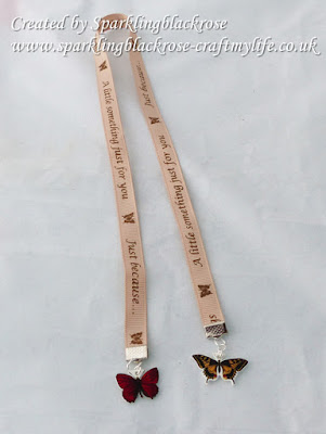 I cut round the butterflies once I was sure the ink was dry and I left a place to punch a hole into so I would be able to attach them to my bookmark.