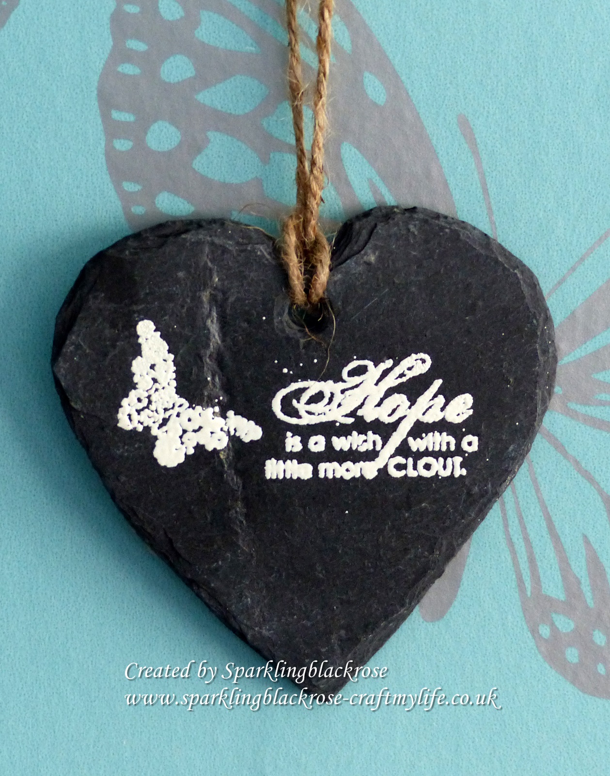 Hey everyone, I hope you are well! I am here with a project to personalise a lovely slate heart I had in my stash. I used Stampin' Up stamps and white embossing powder to emboss an inspirational quote and butterfly decoration onto the heart to give as a gift.