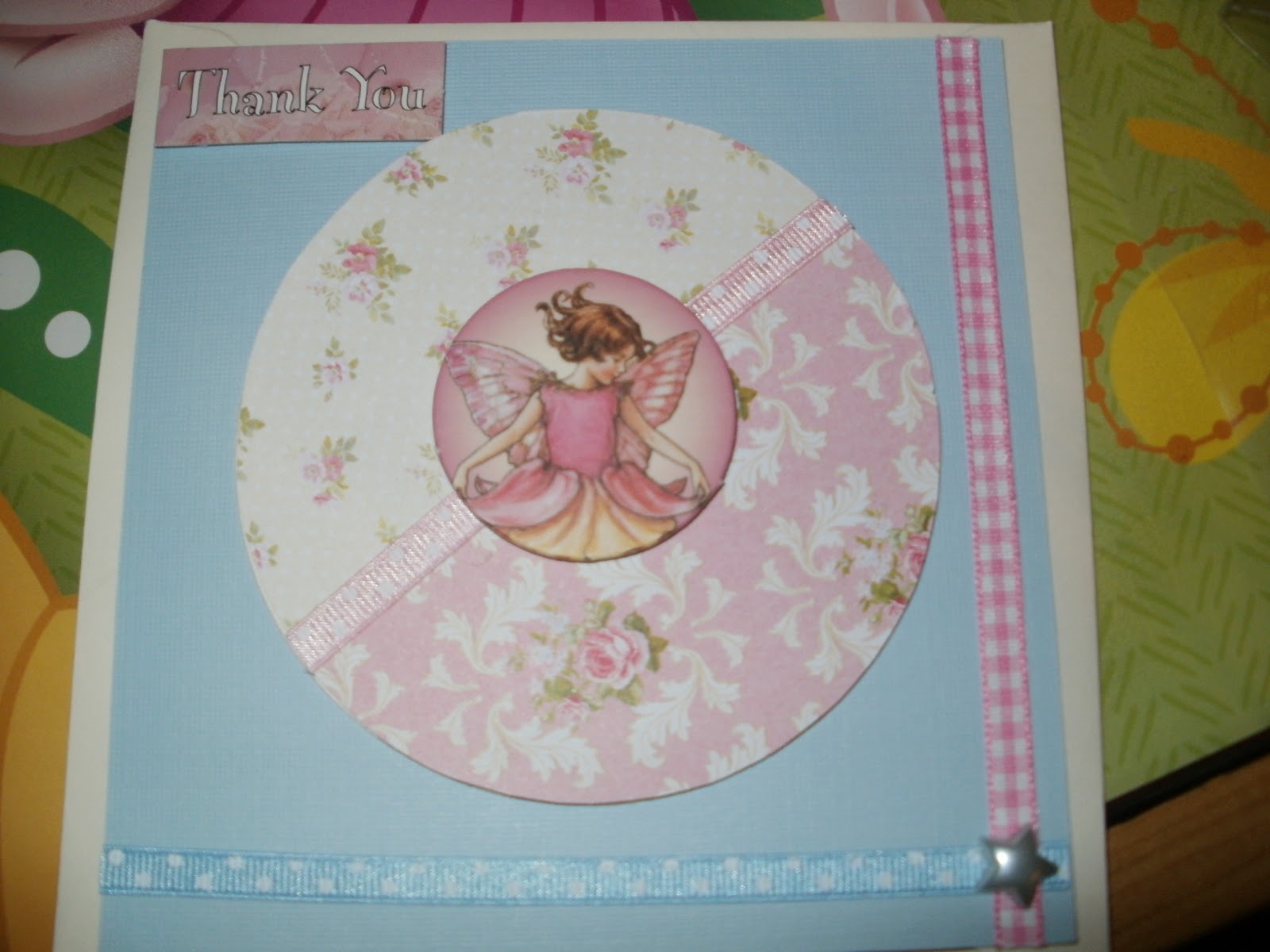 Here is a Flower Fairies card I made using a blue pastel negative that I had used to create a pastel blue circle with my nesties, a circle to fit over the middle covered in two of the 'Rose Garden' papers, with a pink polka dot ribbon between the two. I then used a Flower Fairies Chipboard I got free with 'Lets Make Cards' magazine. I used a blue polka dot ribbon and pink gingham to frame the image on either side, and a 'Thank you' greeting along the top corner. I stuck a blue pearl star embellishment between the two ribbon borders.