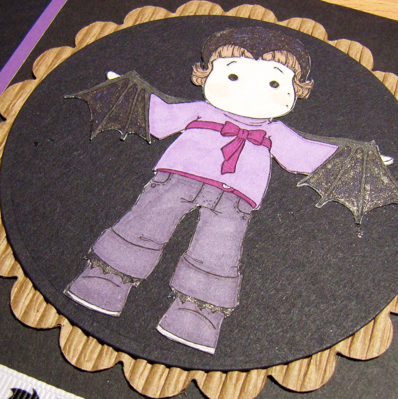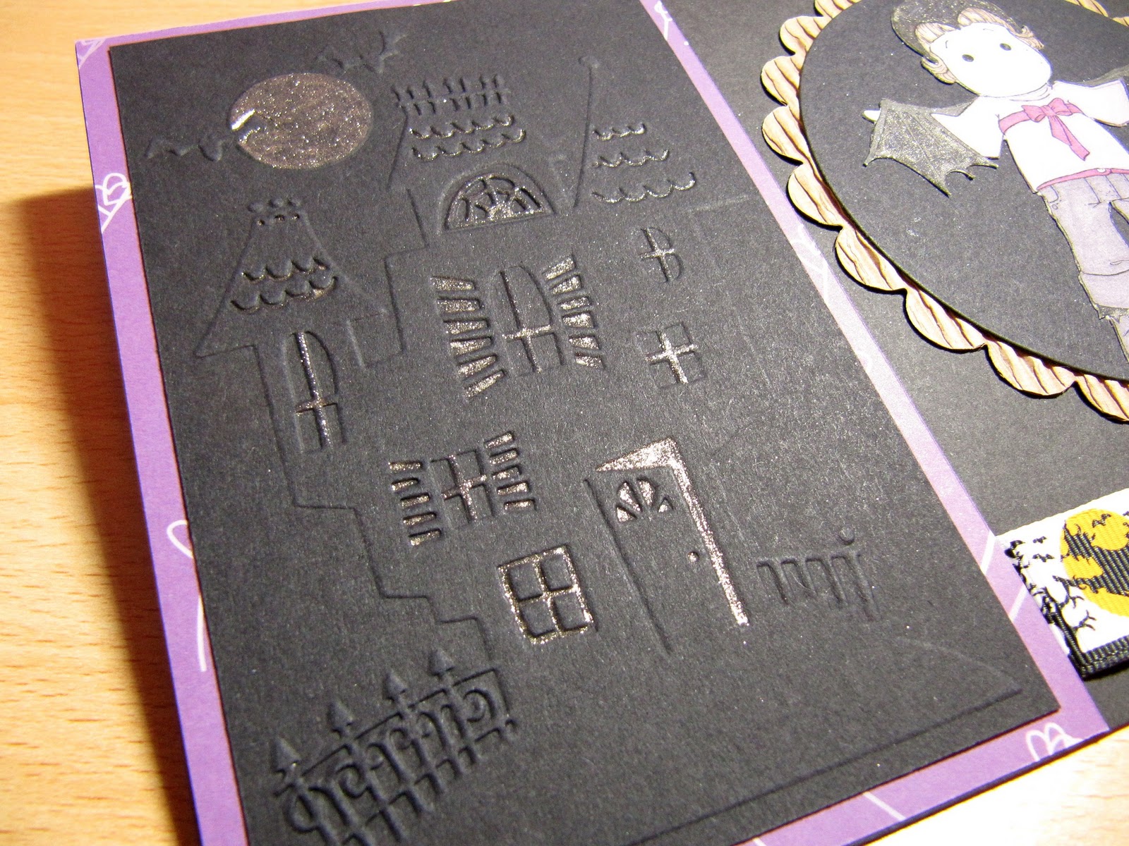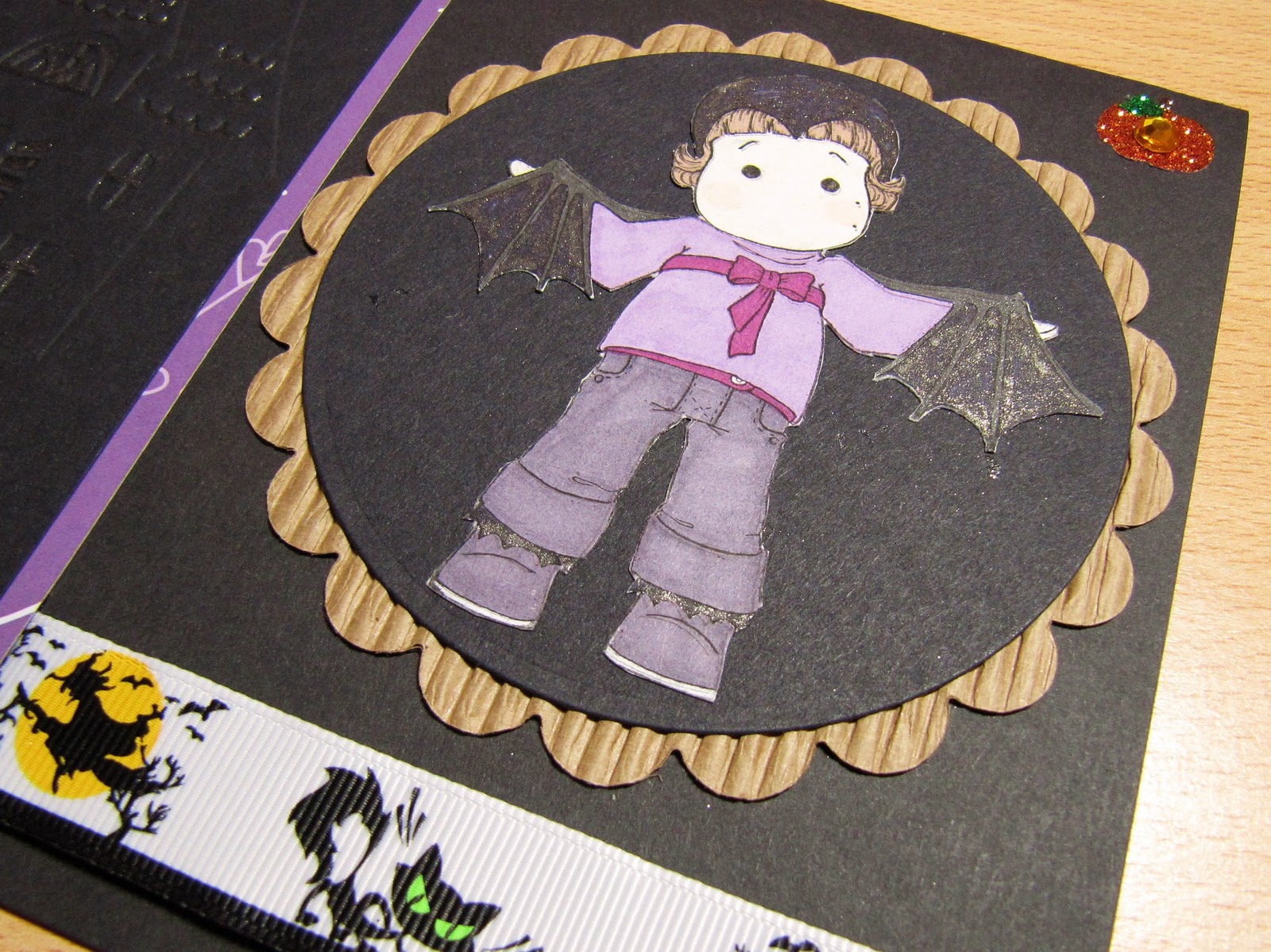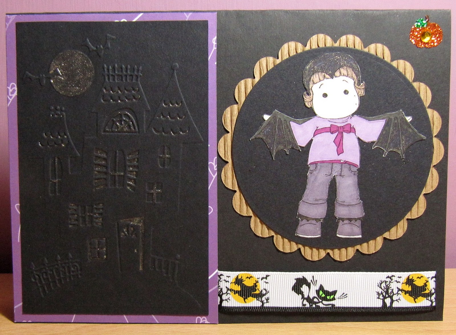 Here is a Halloween Card I made, I put black card through my cuttlebug embossing folder to get the haunted house, then used my glitter pen to highlight certain areas. I then chose a purple backing paper and mounted it onto that, then onto the black card blank. I then stamped Tilda and coloured her using promarkers and my glitter pens, cut her out and mounted her onto a nesties circle in black card, then the circle to a corregated card cut out flower nestie shape. Then mounted her onto the card blank. I then attached the ribbon by placing slits at each end and pushing the ribbon through so you cant see the end, and used double sided tape at each end on the inside of the card. I then added a glitter pumpkin to finish.