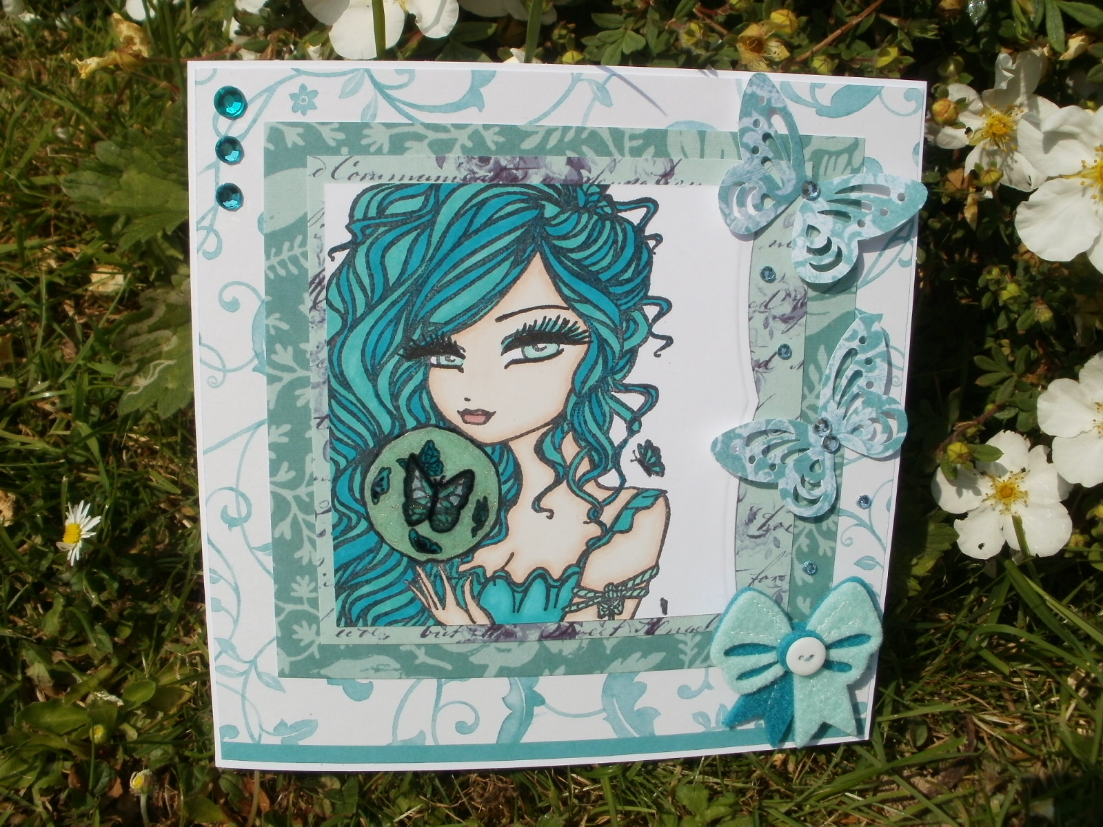 I used Papermania Aqua Capsule collection papers and made a two patterned border under the nestie. I then placed this on a card blank covered with Henbury Lane papers for the flourishes. I then cut two butterflies out of the Capsule collection papers and added matching gems to them, and to make a trail from them. I then added three in the top corner. Lastly I added a felt bow with a button stitched on which complimented her hair.