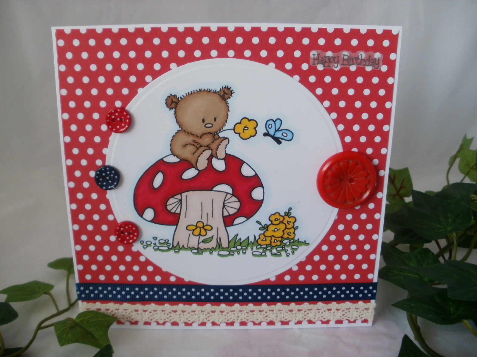 Here I am with my first Guest design project for May for Crafty Sentiments, whose theme is 'Spots or Stripes'. I was given a fabulous digi by Crafty Sentiments that was perfect for the challenge! I coloured him with Promarkers and Flexmarkers and cut round him with a circle nestie. I used Sarah Hurley polka dot papers, Dovecraft polka dot buttons, Happy Birthday sentiment, American Crafts Ribbon and Lace, and a Vintage button from my stash. I wanted to make a focal point of the buttons and I think I managed this quite well!