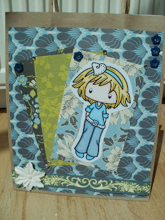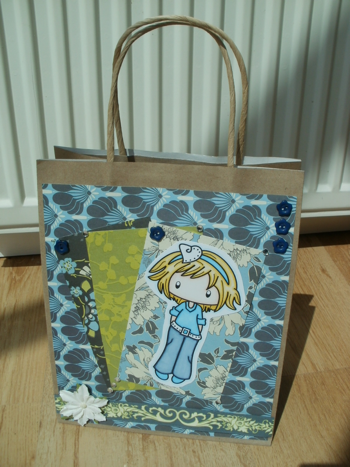 Good morning everyone, here I am on my fixed computer *woo* to show you my Guest design project for this week for Crafty Sentiments Designs, whose theme is Bingo! I chose to use Buttons, the coloured image and gems as my bingo line. I was given the gorgeous image from Crafty Sentiments which I coloured with Promarkers and Flexmarkers. I then used some gorgeous papers and ribbon from K&Co by Amy Butler, with a Prima flower, buttons and gems on a Kraft gift bag.