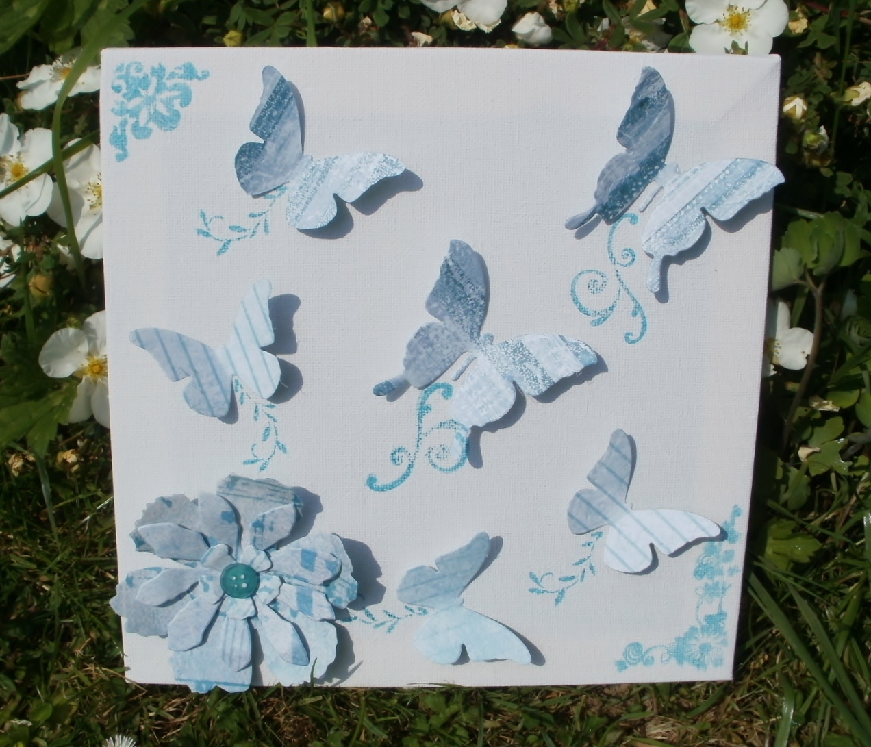 I used a plain white canvas, and cut out Butterflies with Spellbinders dies, and a flower with Tim Holtz Tattered florals die out of Tim Holtz Vintage Shabby cardstock. I arranged these and folded and shaped them how I liked the look of them-where they are light cardstock they have the strength to do this where paper wouldn't.