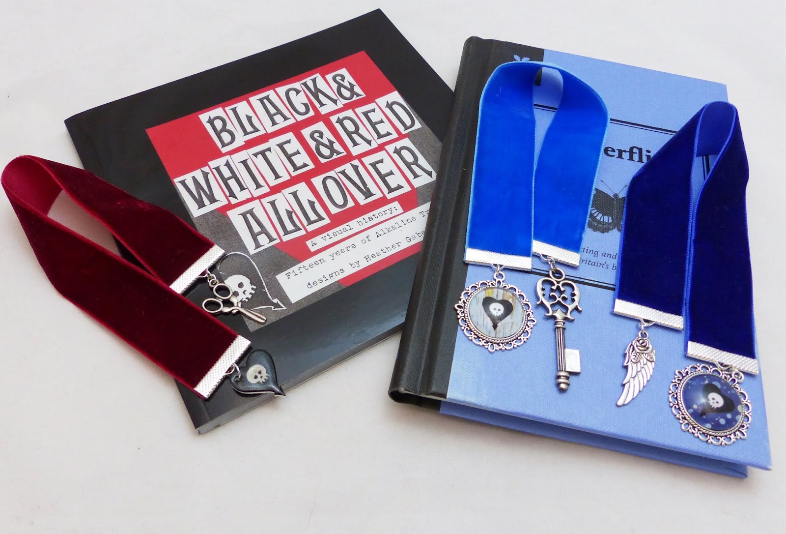 Hey everyone, I am here with some little gifts I made for some of my Trio friends. Velvet trio themed bookmarks. I used shrink plastic, blank metal and glass pendants and assorted charms, velvet ribbon, and ribbon clasps.